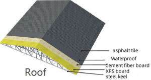 The roof truss is assembled by various light steel components. Generally, there are triangular roof truss and T-shaped roof truss, which can easily and flexibly realize various complex roof shapes. The general roof adopts colorful asphalt tiles, which have good waterproof performance and highlight beauty and quality.